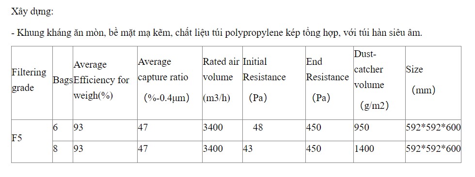 Thông tin chi tiết khung lọc túi hiệu quả F5