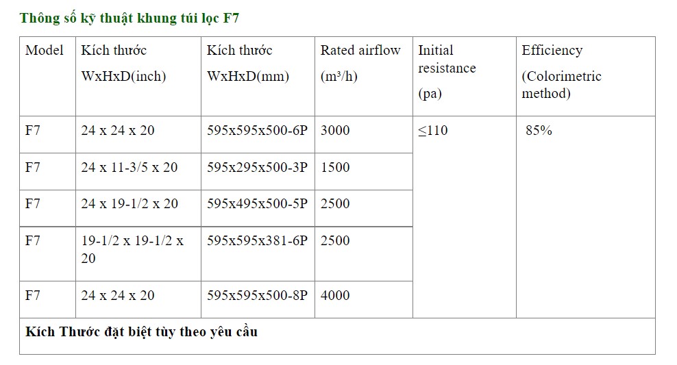 Về kích thước, khung lọc được sản xuất với các thông số tiêu chuẩn 287×592×550mm hoặc 592×592×550mm. Tuy nhiên, khách hàng có thể đặt theo kích thước mong muốn phù hợp với hệ thống hiện hữu. Số lượng túi trong mỗi bộ lọc dao động từ 3 đến 8 túi, giúp tối ưu diện tích lọc và hiệu suất vận hành.